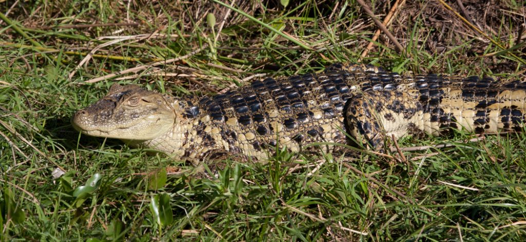 Despite its crocodilian appearance, the broad-snouted caiman’s main food source is fish and small invertebrates, including snails which are very common at the reserve.. Â An adult can reach eight feet (2.5m) in length, and sizes of over 10 feet (3m) have been recorded although they are normally less than 2m in length with females being smaller. Â The name comes from the very broad snout which makes it distinctive from the more common Spectacled Caiman.Â