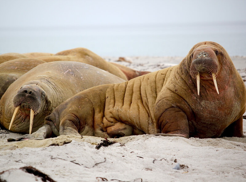 The walrus is a large flippered marine mammal with a discontinuous distribution about the North Pole in the Arctic Ocean and subarctic seas of the Northern Hemisphere.
